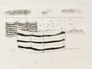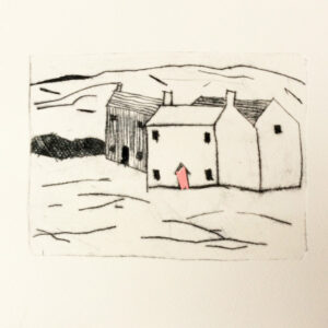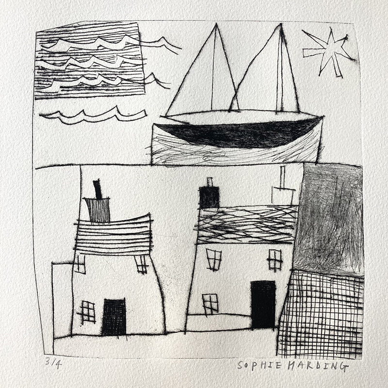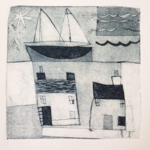 Cornish Boat and Houses drypoint etching